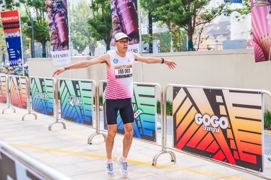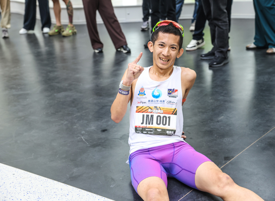 图为来自马来西亚的选手Soh Wai Ching(苏为庆)以7分05秒的成绩第一个冲过终点线,获得本次大赛冠军。